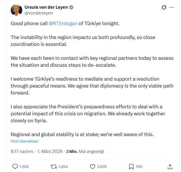 Von der Leyen, görüşmenin ardından X (eski adıyla Twitter) hesabından yaptığı paylaşımda diplomatik çözümün tek seçenek olduğunu vurguladı. Bölgedeki istikrarsızlığın hem Türkiye’yi hem de Avrupa’yı derinden etkilediğine dikkat çeken Leyen, yakın koordinasyonun önemine işaret etti.