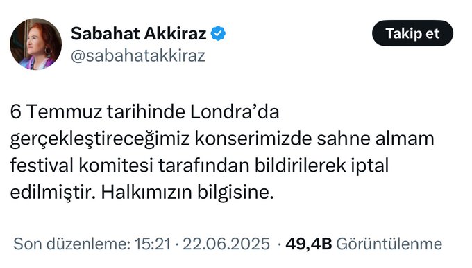 Akkiraz, iptali sosyal medya hesabından duyurarak, “6 Temmuz tarihinde Londra’da gerçekleştireceğimiz konserimizde sahne almam festival komitesi tarafından bildirilerek iptal edilmiştir. Halkımızın bilgisine.” ifadelerini kullandı.