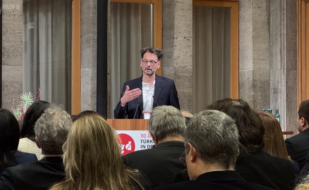 Başkent Berlin’de Robert Bosch Vakfı binasının konferans salonunda düzenlenen etkinliğe, TGD’nin bölge dernekleri, federasyon yöneticileri ve çok sayıda davetli katıldı. Moderatörlüğünü Özge Uslu ve Doğuş Albayrak’ın yaptığı kutlama, Alman sanatçı Petra Nachtmanova’nın saz eşliğinde seslendirdiği Türkçe deyişlerle başladı.