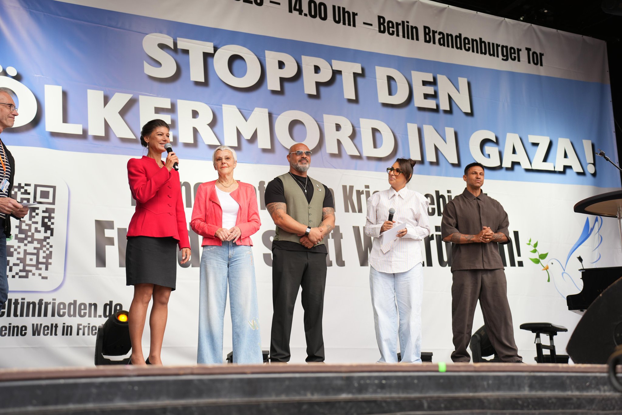 Gazze’de soykırımı durdurun! (Stoppt den Völkermord in Gaza) sloganı ile kitleye seslenen Wagenknecht, Hamas’ın 7 Ekim’de İsrail’e düzenlediği saldırıyı ve sivillere yönelik katliamı kınadığını vurguladı. Ancak bunun Gazze’de “iki milyondan fazla insanın, yarısı çocuk olan bir nüfusun bombalarla öldürülmesini, aç bırakılmasını ve göçe zorlanmasını meşru kılamayacağını” söyledi.