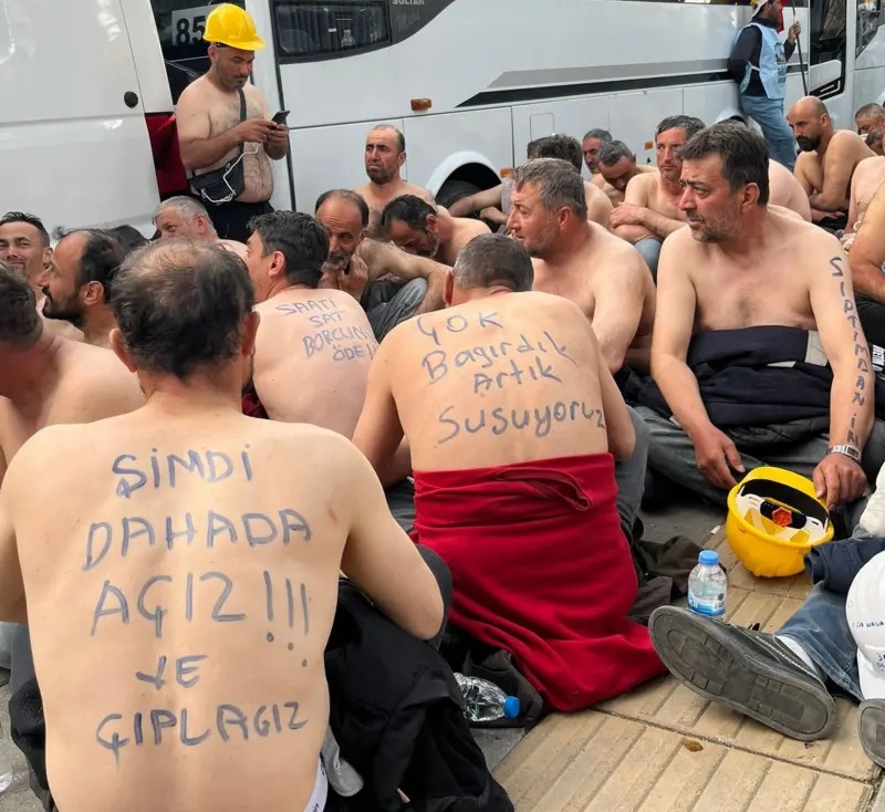 Bakanlık önünde eylemlerini sürdüren madenciler, üstlerini çıkararak başlattıkları açlık grevini devam ettiriyor. “Açız, yoksuluz, çıplağız” sloganları atan işçiler, baretlerini yere vurarak tepkilerini dile getiriyor.