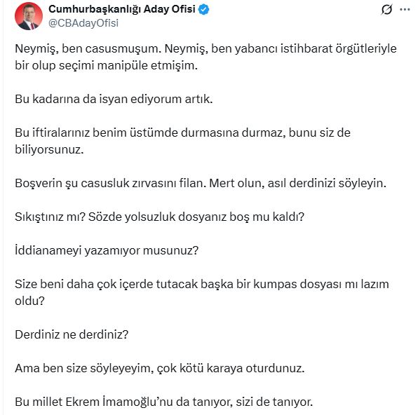 Kaftancıoğlu, sosyal medya hesabından, İmamoğlu'nun paylaşımını alıntılayarak, şunları kaydetti: