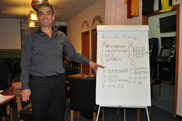 Galatasaray Hamburg Derneği başkanı Mehmet Günyar’ın sahibi olduğu sporcuların buluştuğu Gol Lounge lokalinde gerçekleşen çekilişe takımları temsil eden yöneticiler katıldı.. A grubunda Trabzon Derneği, Yeni Malatya, A.K.D ve HADD, B grubunda Taxi, Hamburg Türk Basın Karması, HAAK-Bir ve DİTİB, C grubunda, Marmara, Hamburg Galatasaray Derneği, Mileniyum ve HH Sivaslılar Derneği, D grubunda Hamburg Fenerbahçe Derneği, Dadaş, Öğretmenler ve Aydınspor takımlarının katılayacağı turnuva, 28 Ekim Pazar günü Nettelnburg Allermöhe, Ladenbeker Fuhrtweg adresinde saat 10.00-18.00 arasında yapılacak. 16 takımın iştirak edeceği turnuva dört grupta oynanacak ve her grupta ilk iki sırayı alan takımlar çeyrek finale çıkacak. Aykut Kartal ve Önder Zeybek’in salonda düdük çalacağı turnuva organize komitesinde Önder Zeybek, Murat Comart, Hikmet İleri ve Kamuran Pelek bulunuyor