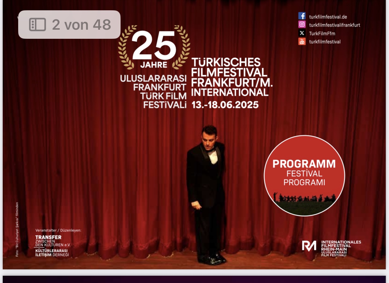 Franfurttaki Festivalle ilgili tüm Bilgileri bu Linke tıklyarak ulaşabilirsiniz ; https://www.turkfilmfestival.de/wp-content/uploads/2025/06/TFF_prg2025-finale-2.pdf
