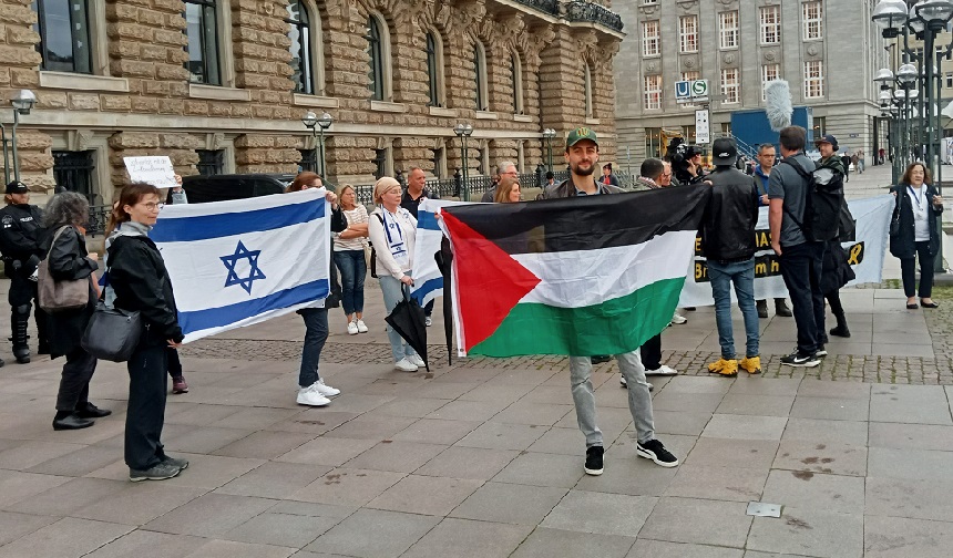 Çok sayıda polisin güvenlik önlemi aldığı gösteri sırasında, ellerinde İsrail bayrakları taşıyan Hamburg Yahudi Cemaati'nden bir grup Filistin yanlısı gösteriyi sessizce protesto etti.