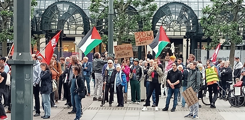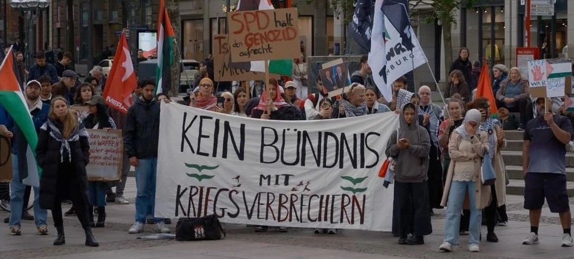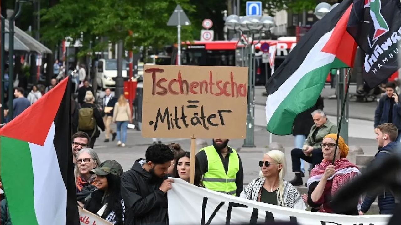 Göstericilerin taşıdığı bir pankartta Hamburg Belediye Başkanı Peter Tschentscher için “Tschentscher = Suça ortak” ifadeleri yer aldı. Göstericiler, Tschentscher’in Gazze’deki sivillerin yaşadığı acılara kayıtsız kaldığını ileri sürdü.