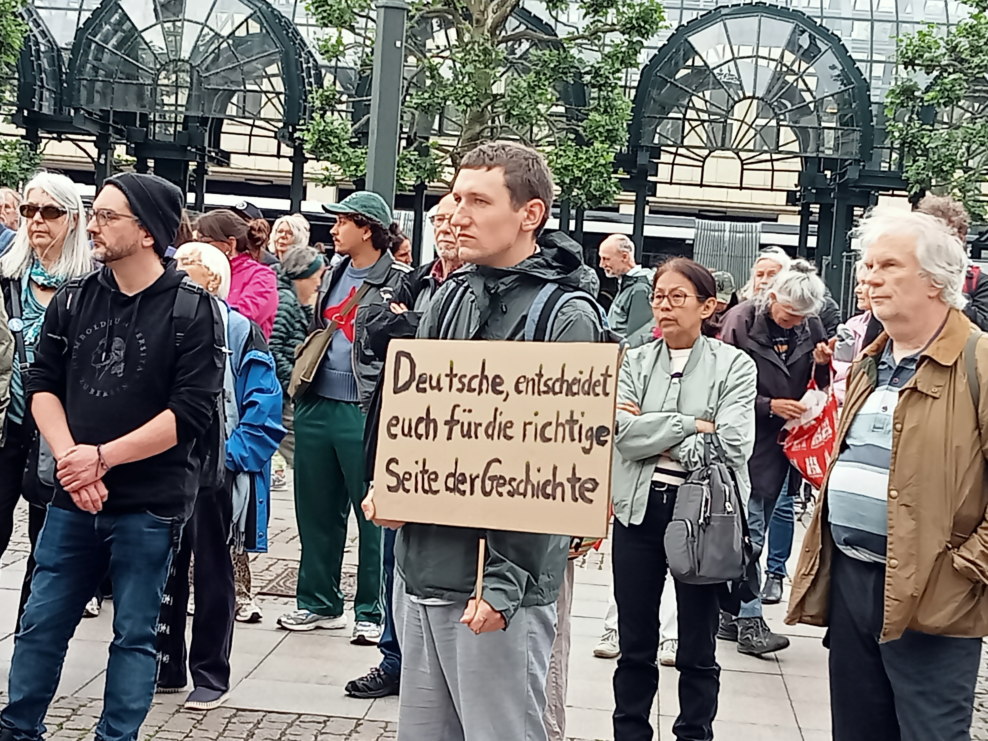 Gösteri, Hamburg’daki İslami Cemaatler Konseyi Schura, SPD Gençlik Kolları (Jusos) ve Sol Parti’nin (Die Linke) ortak çağrısıyla “İnsan hakları, insan onuru, uluslararası hukuk – bu savaş sona ermeli” sloganıyla düzenlendi.