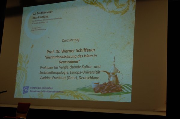 Schleswig-Holstein eyaleti Adalet-Kültür ve Avrupa Bakanlığı adına Dr. Eberhard Schmidt-Elsaesser, Protestan Kilisesi’nden Kirsten Fehrs ile Katolik Kilisesinden Bay Yaschke, Frankfurt (Oder) Üniversitesi’nden Prof. Dr. Werner Schiffauer de konuşmacılar arasındaydılar. Hepsi de bu geceye katılmaktan duydukları memnuniyeti dile getirirlerken, Ramazan ayının önemi ve Almanya’daki İslam konularına ve özellikle de Müslüman dini kesim temsilcileriyle Hamburg Senatosu arasında imzalanacak Hak Eşitliği Anlaşması konusuna yönelik olumlu sözler sarfettiler.