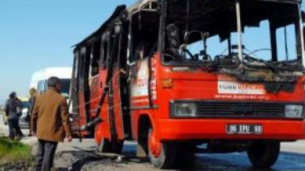 Olay, bugün saat 10.30 sıralarında Antalya- Alanya Karayolu Çandır Belde Kavşağı'nda meydana geldi. Serik Belediyesi önünde düzenlenecek kan bağışı kampanyası için Antalya'dan hareket eden Abdulkadir Halci yönetimindeki 06 EPU 60 plakalı midibüs, Çandır Belde Kavşağı'na geldiği sırada hareket halindeyken yanmaya başladı. Motor kısmında başlayan yangın, kısa sürede tüm aracı sardı. Şoför ve içindeki 3 personel midibüsten inerek itfaiyeye haber verdi. İtfaiye ekiplerinin müdahalesine rağmen araç tamamen yandı.