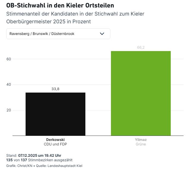 Kent genelinde oyların büyük bölümü sayılırken, özellikle Ravensberg–Brunswik–Düsternbrook seçim bölgesinde Yılmaz’ın belirgin üstünlüğü dikkat çekti. Bu bölgede Yılmaz %66,2, Derkowski ise %33,8 oy aldı. Seçim bölgesinde katılım oranı %56,8 olarak kaydedildi.