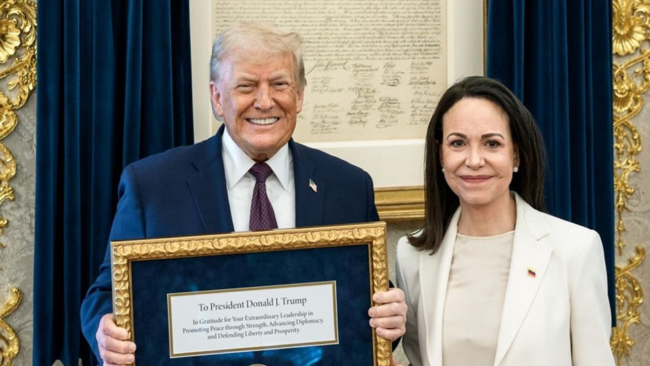 Machado, geçen yıl Oslo’da aldığı Nobel Barış Ödülünü, geçtiğimiz hafta Beyaz Saray’da Donald Trump’a teslim etmişti. Görüşme basına kapalı gerçekleşirken, Trump daha sonra sosyal medya platformu Truth Social üzerinden yaptığı paylaşımda, Machado’nun kendisine madalyayı sunduğunu doğruladı.