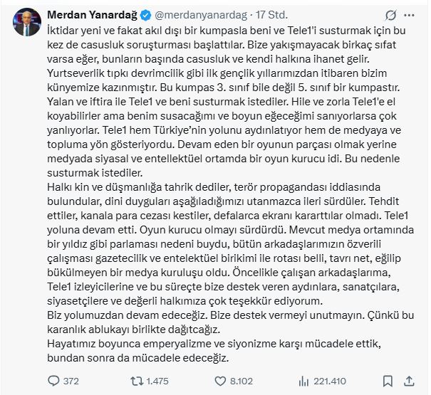 Merdan Yanardağ, sosyal medya üzerinden yayımladığı açıklamada, iktidarın kendisini ve Tele 1'i susturmak için "yeni ve fakat akıl dışı bir kumpasla" casusluk soruşturması başlattığını belirtti. Casusluk ve kendi halkına ihanetin kendilerine yakışmayacak sıfatlar olduğunu vurgulayan Yanardağ, "Yurtseverlik tıpkı devrimcilik gibi ilk gençlik yıllarımızdan itibaren bizim künyemize kazınmıştır. Bu kumpas 3. sınıf bile değil 5. sınıf bir kumpastır." ifadelerini kullandı.