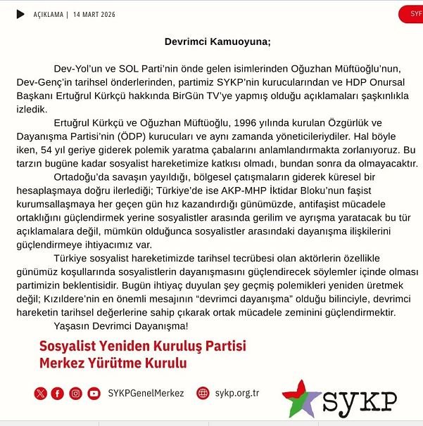 Müftüoğlu’nun BirGün TV’de Ertuğrul Kürkçü’ye yönelik açıklamalarına Kürkçü’den henüz yanıt gelmezken, Sosyalist Yeniden Kuruluş Partisi (SYKP) bir değerlendirme yayımladı. Parti, sosyalist hareket içinde geçmiş polemiklerin yeniden gündeme getirilmesinin doğru olmadığını vurguladı.