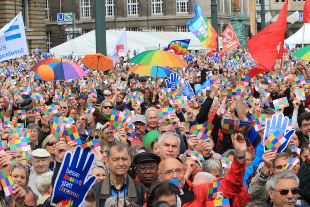 Aralarında SPD’li Hamburg belediye başkanı Olaf Scholz’un konuşmacı olarak katıldığı Eyalet parlamentosu önündeki ilk karşı gösteriye Türkiyeli göçmen örgütleri de yoğun katılım sağladılar. 10 bin kişinin katıldığı açıklanan gösteri esnasında Gänsemarkt semtinde Antifa‘ların öncülüğünde bir başka gösteri vardı.