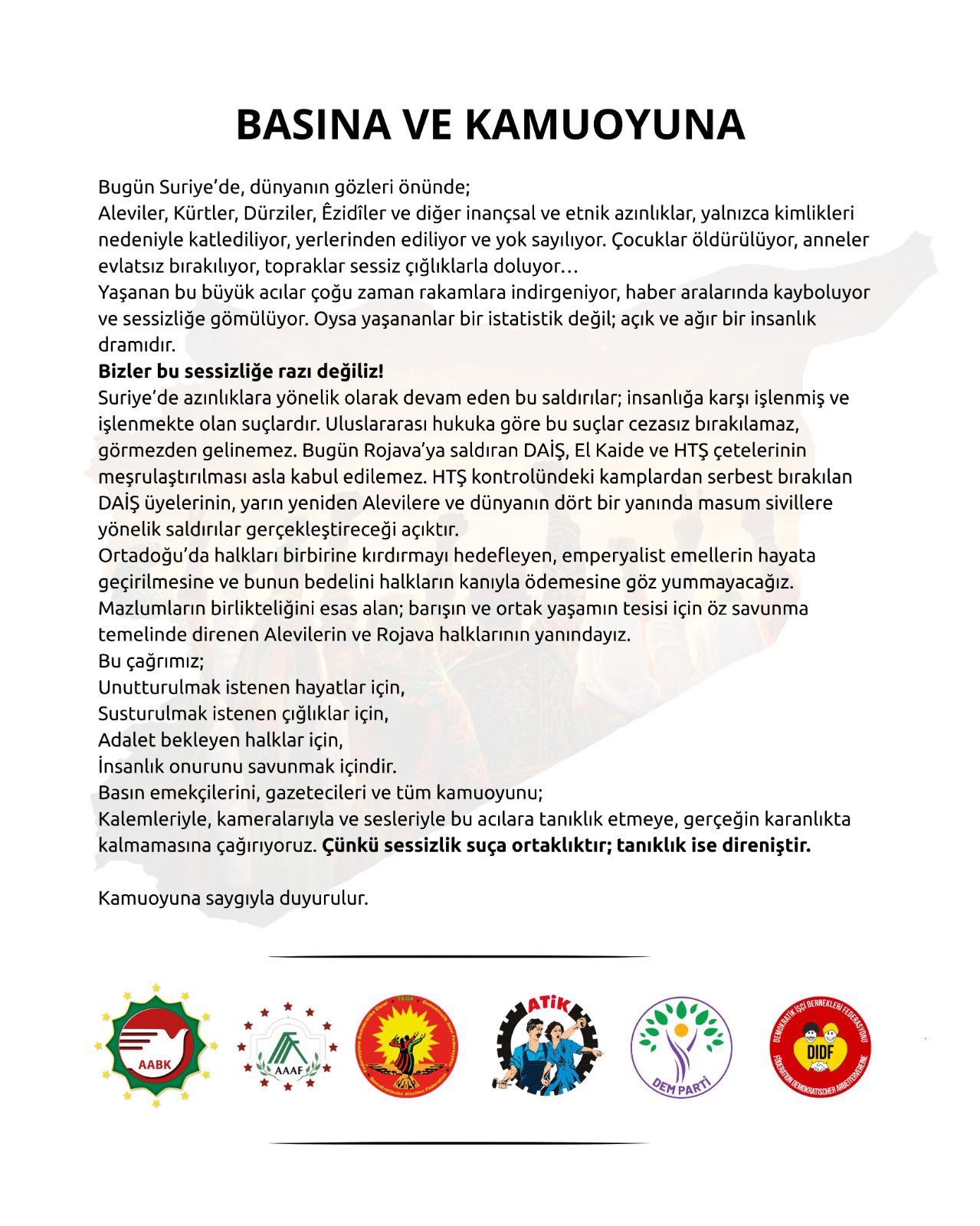 Suriye’deki azınlıklara yönelik saldırılara karşı AABK, AAAF, FEDA, ATİK, DİDF ve DEM Parti imzalı ‘Basına ve Kamuoyuna’ başlıklı ortak açıklama şöyle: